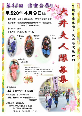 4月9日に行われる「信玄公祭りの大井夫人隊」につきましては募集定員に達しました。お申込みありがとうございました。 お問い合わせ先 南アルプス市観光商工課 (TEL 055-282-6294)