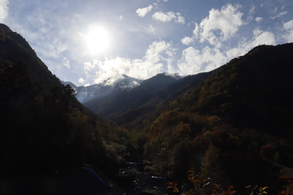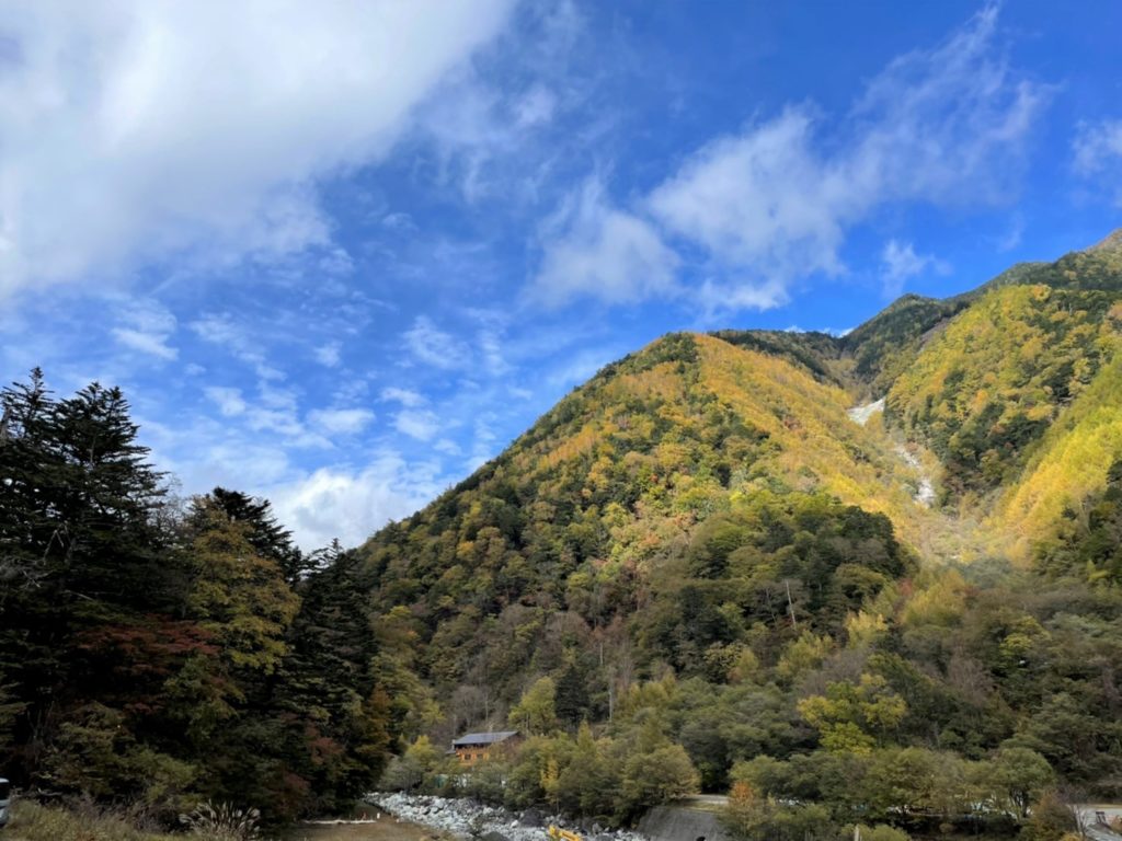 10月27日(木)広河原へ…南アルプス林道沿いの紅葉もきれいに色づいていました!見頃まではあと少しといったところでしょうか。午後、雲の切れ間から雪化粧した北岳を望むことができました。