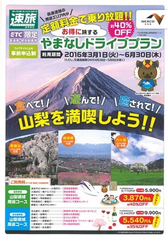 春先の行楽シーズンから、山梨県内の観光振興と高速道路の利用促進を目指して、3月1日から6月30日の期間で『速旅「やまなしドライブプラン」(ETC車限定)』を実施しています。東京・神奈川・名古屋の各エリアから山梨県内の高速道路を2日間乗り放題となる割引企画です。