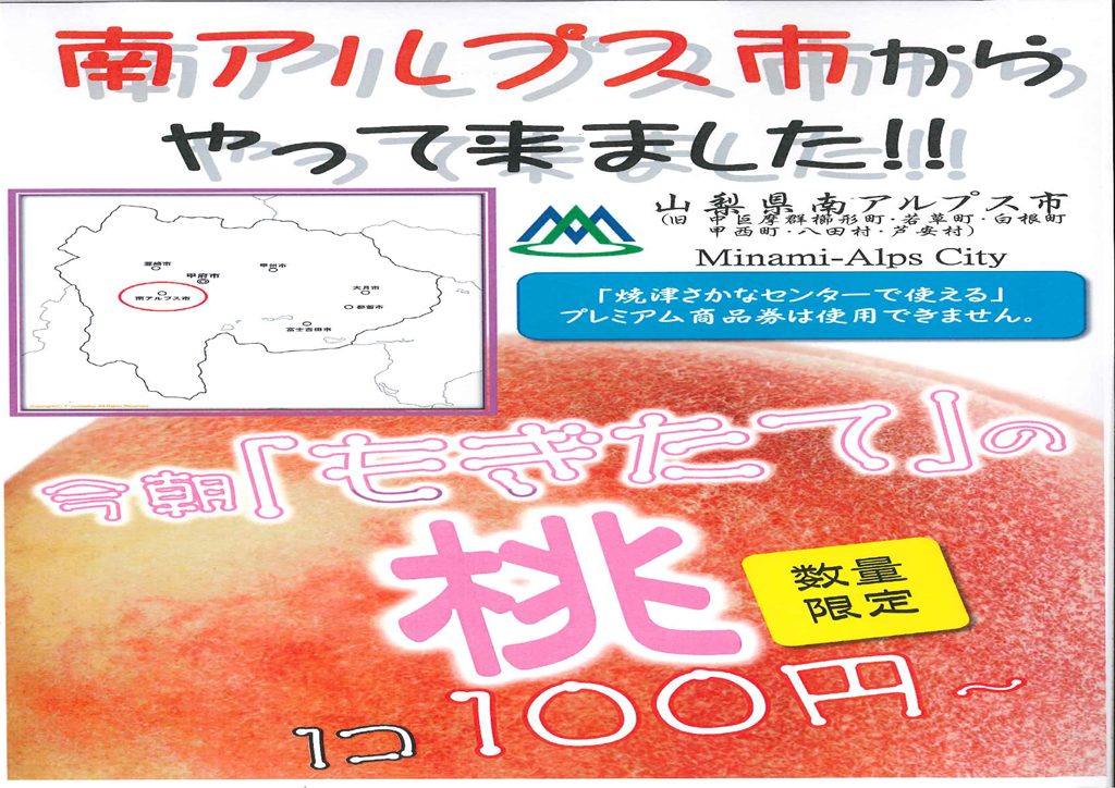 この日は同所において『焼津さかなセンターの日』という大きなイベントの開催があり、南アルプス市では今が旬の「桃」を出張販売いたします。