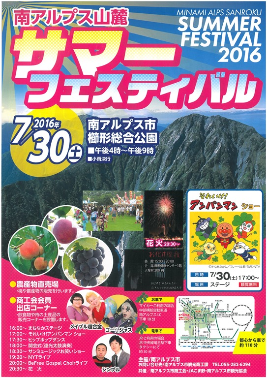 7月30日は南アルプス市の夏祭りである「南アルプス山麓サマーフェスティバル2016」が開催されます。