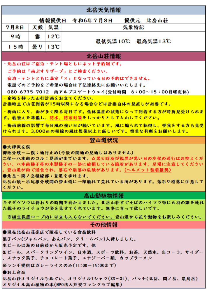 雨が降り続いています。余裕をもった登山計画を心掛けください。
