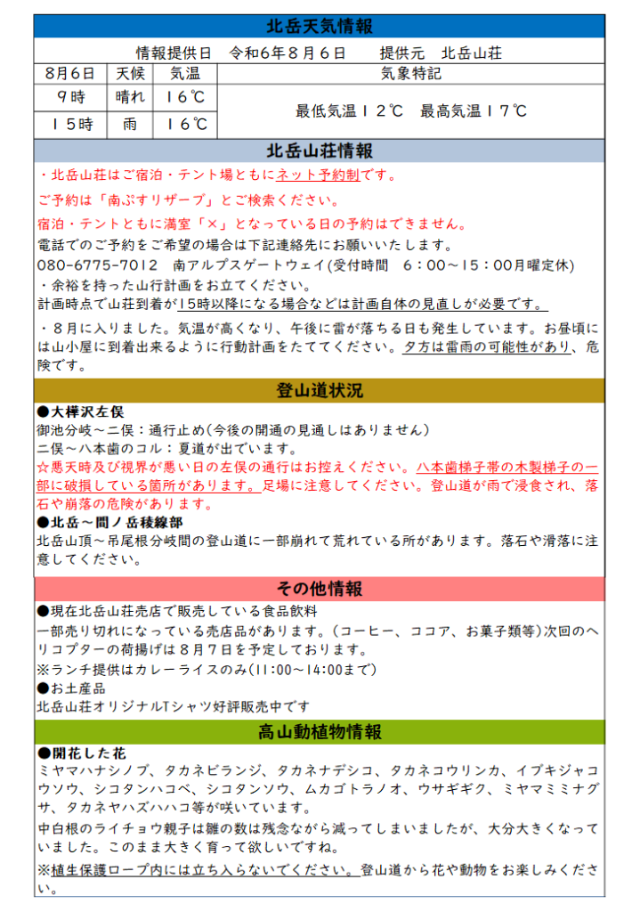 令和6年8月6日の北岳情報です。ゲリラ豪雨や不安定な天候が続いています。入念な登山計画と装備を整えて夏山登山を楽しんでください。