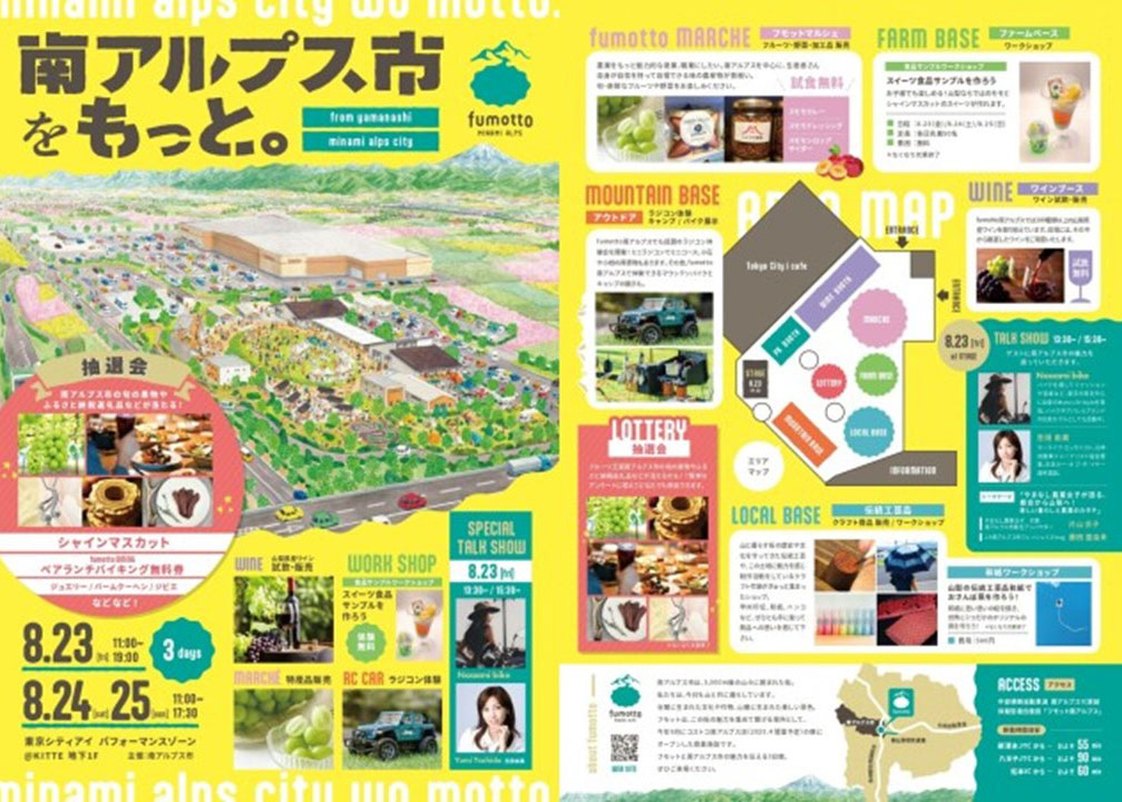 南アルプス市産の旬の果物、野菜等の特産品の販売、山梨県産ワインの試飲・販売、豪華賞品が当たる抽選会やワークショップ、fumotto南アルプスで人気のラジコン体験等、お楽しみがいっぱい!ぜひ、お立ち寄りください。