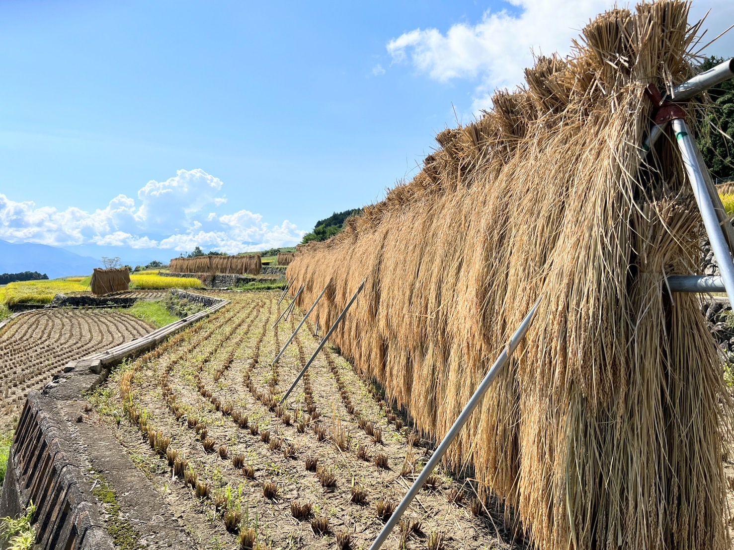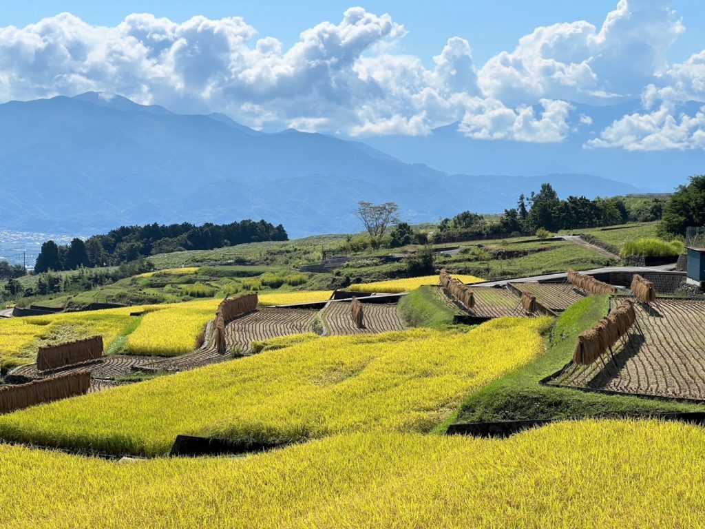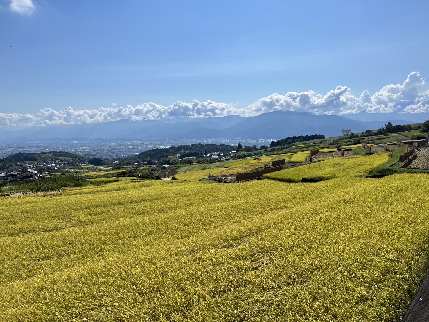 朝晩は涼しさを感じるようになりましたが、日中はまだまだ暑い南アルプス市。棚田は稲刈りが始まり、黄金の絨毯もそろそろ見納めになりそうです。