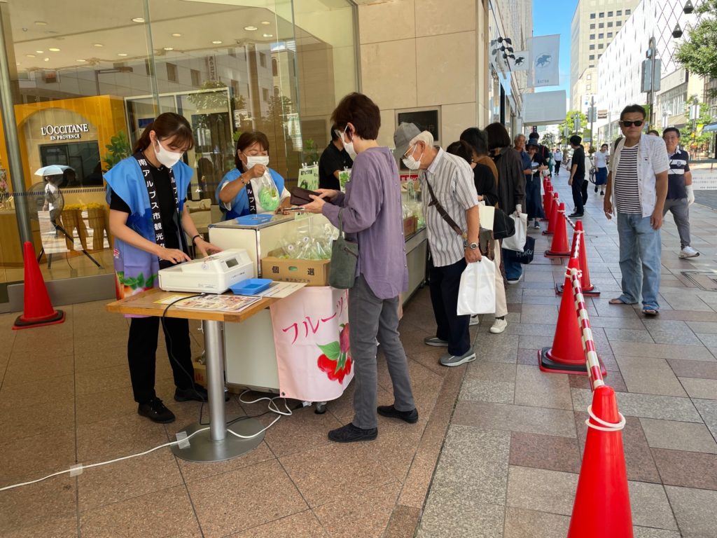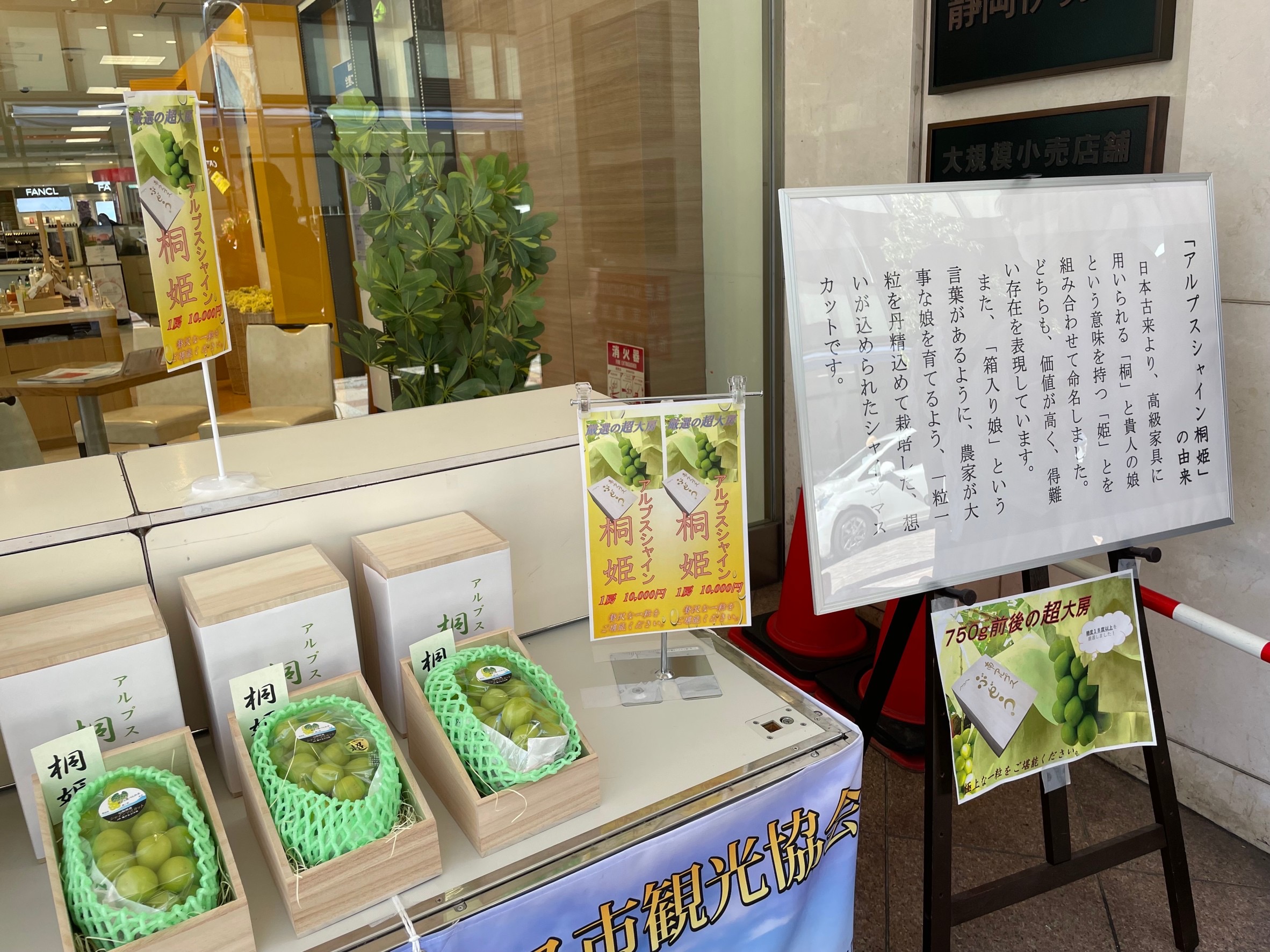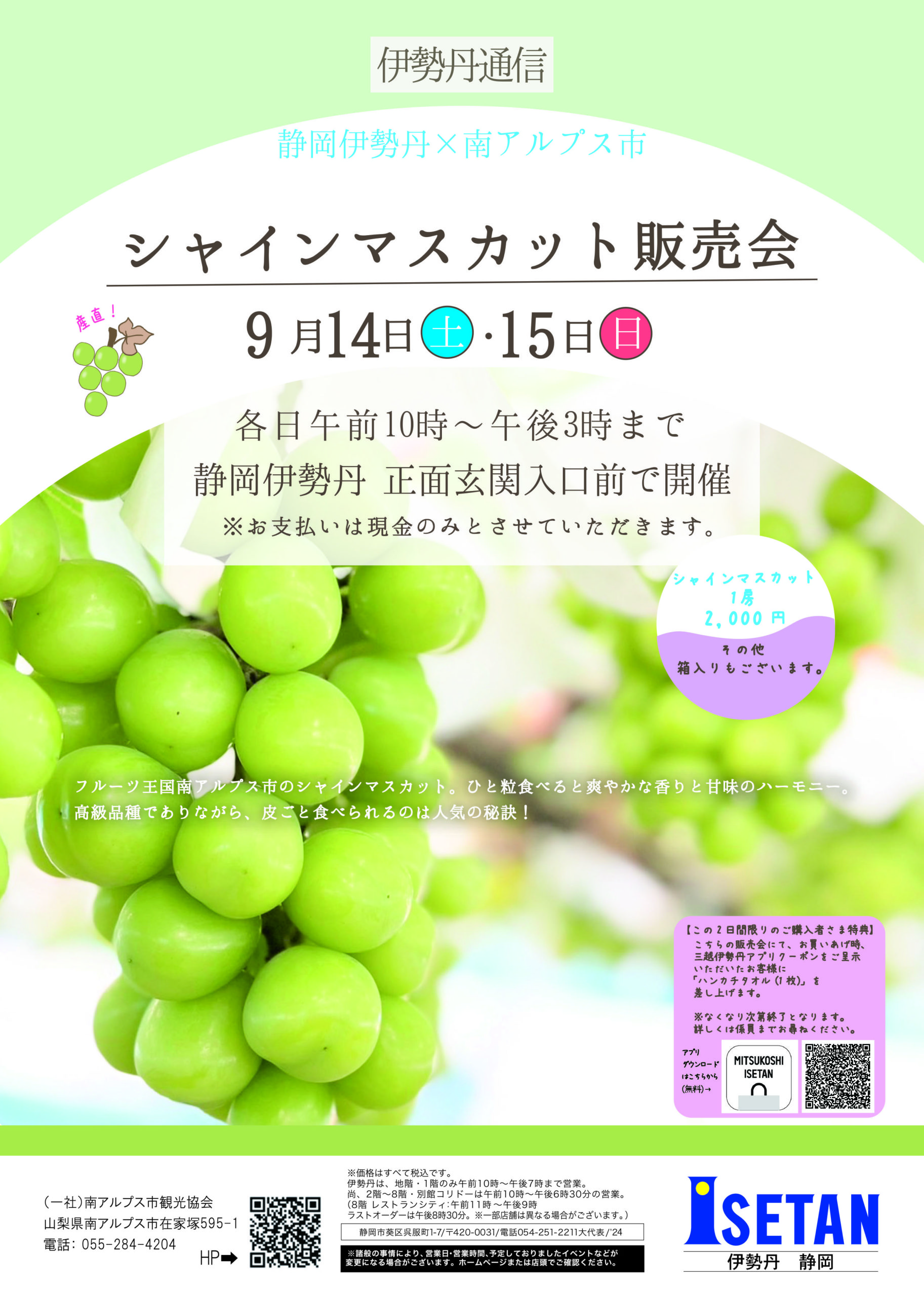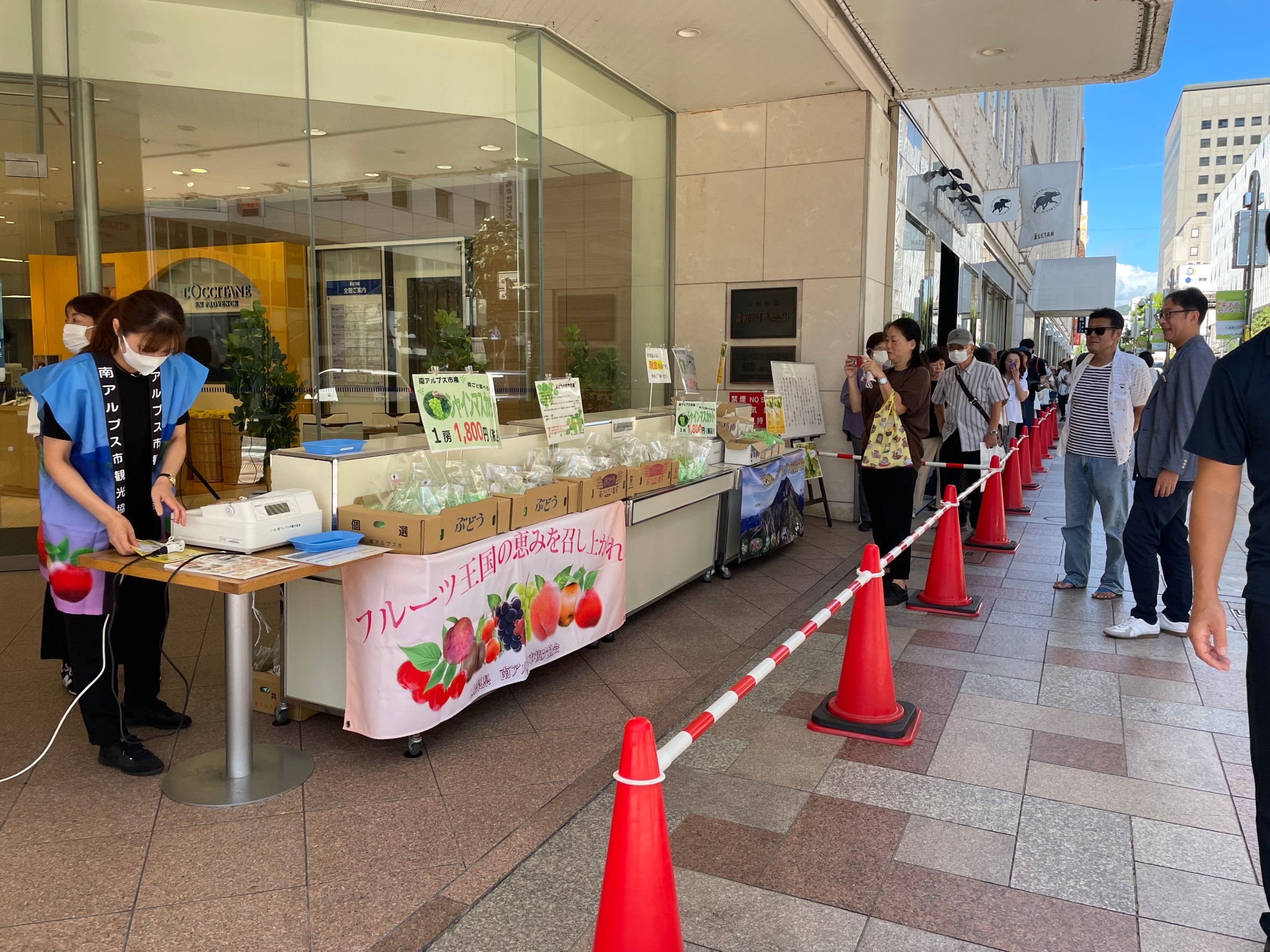 昨日(9/14)と本日(9/15)の2日間にわたって南アルプス市の旬のシャインマスカットをお届け!昨日は販売前から大勢のお客様にご来店いただきありがとうございました。あっという間に完売でした。本日も早めのお越しをお待ちしております。