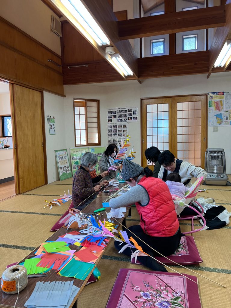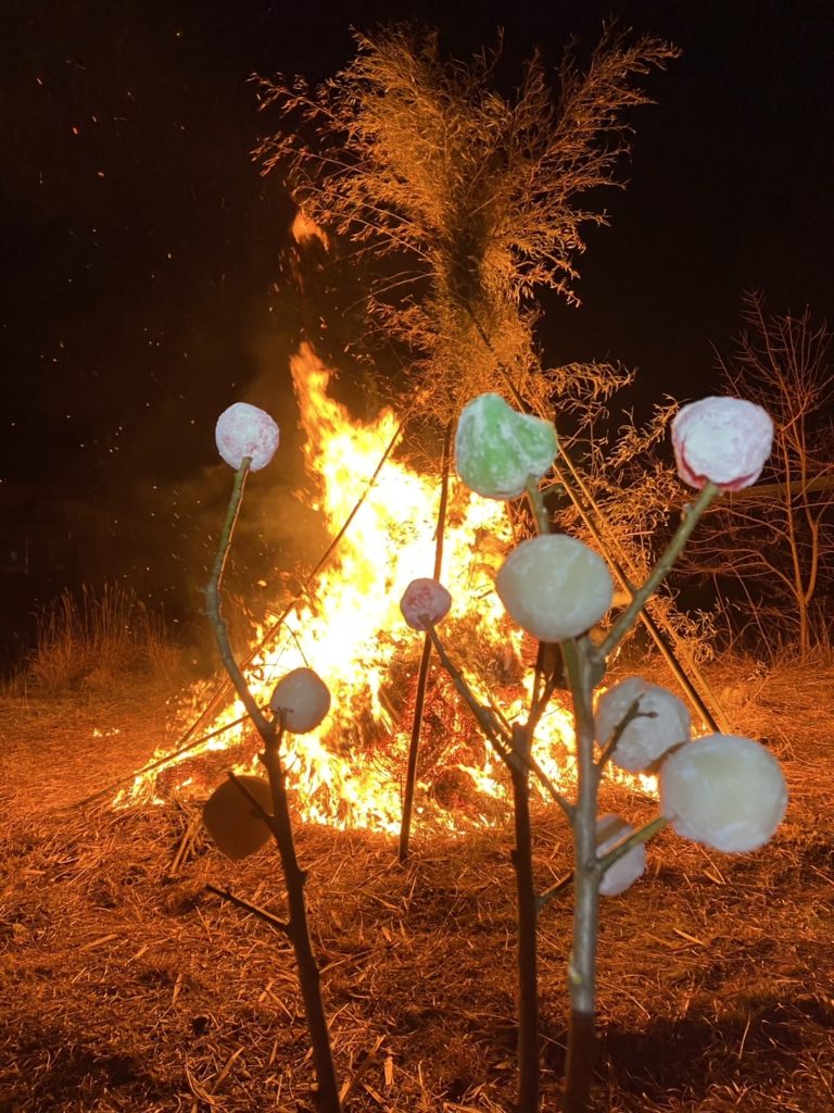 地域ごとに飾りものなどに違いはありますが、米粉で作ったお団子(まゆ玉)を枝に付けて火であぶったものを食べ、1年の無病息災・五穀豊穣・家内安全を祈願します。