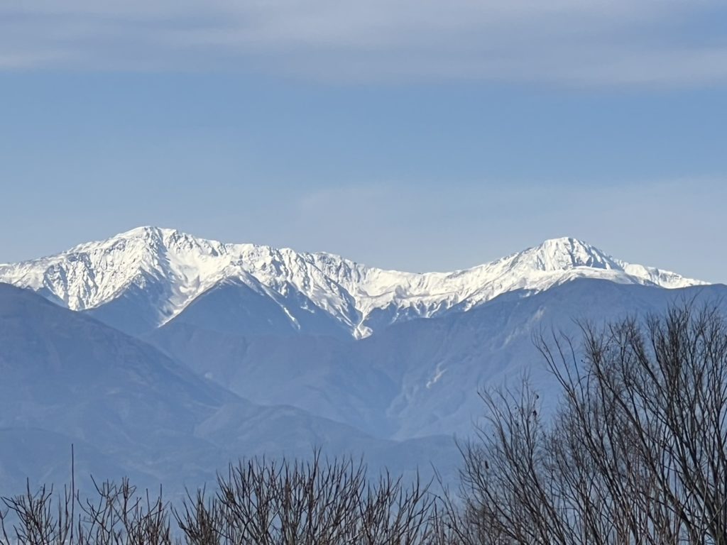 1月上旬に笛吹市から見た北岳と間ノ岳です。3千メートル級の山々が連なる南アルプス山脈。山肌に沿う積雪がとても美しい!