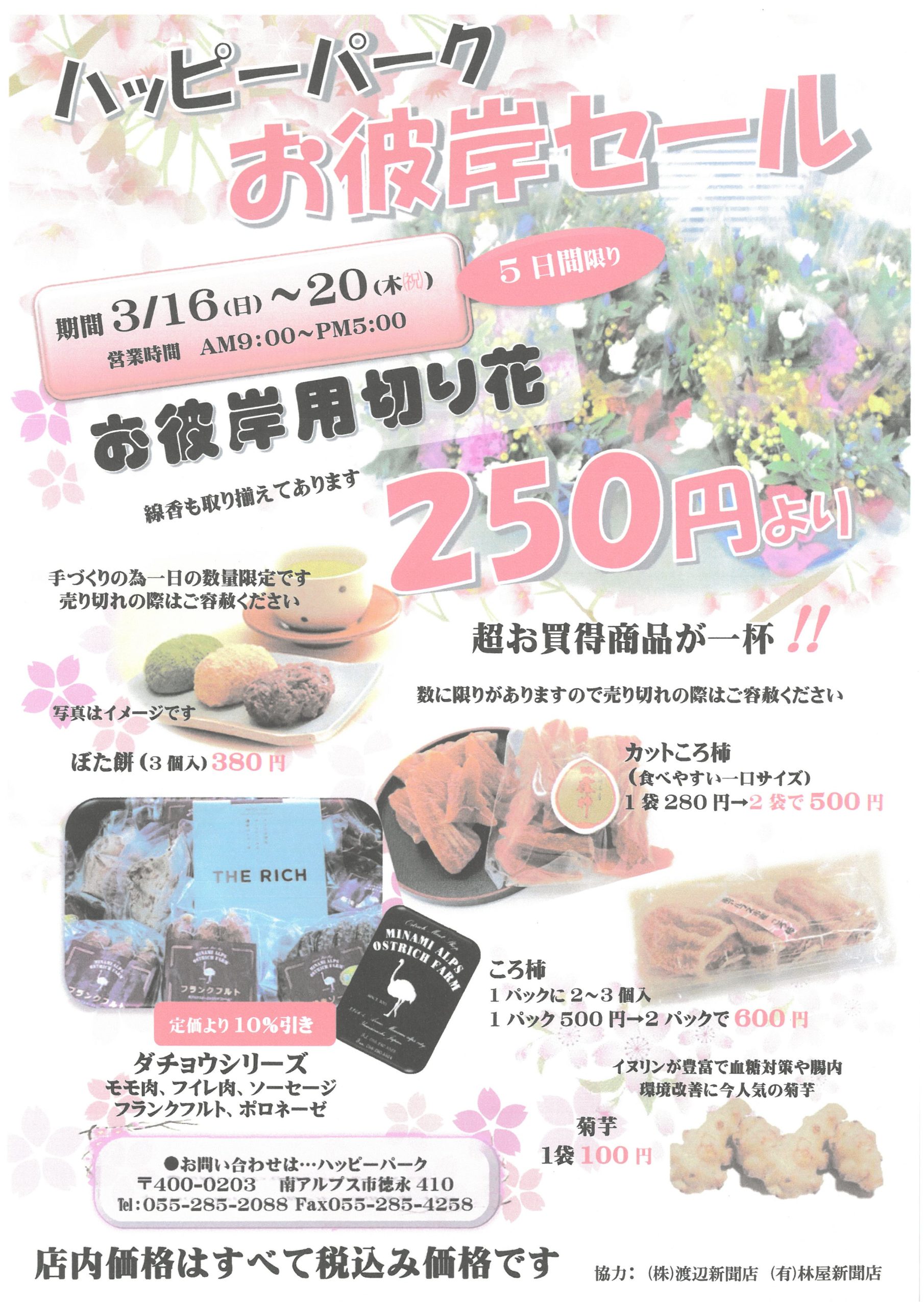 ハッピーパークより5日間のお彼岸セール開催中!お彼岸用切り花、手づくりのぼた餅、お線香のお彼岸セットが揃っています。数に限りがございますのでお早めにどうぞ。