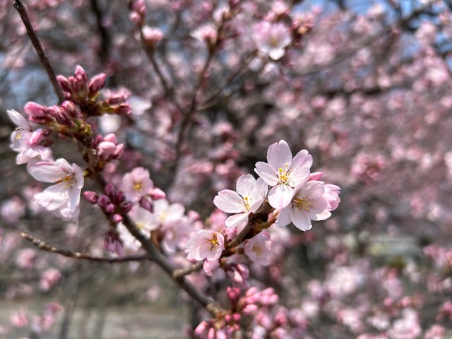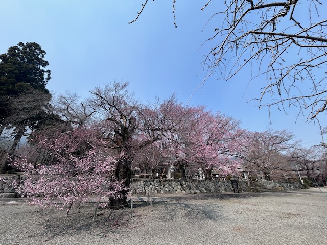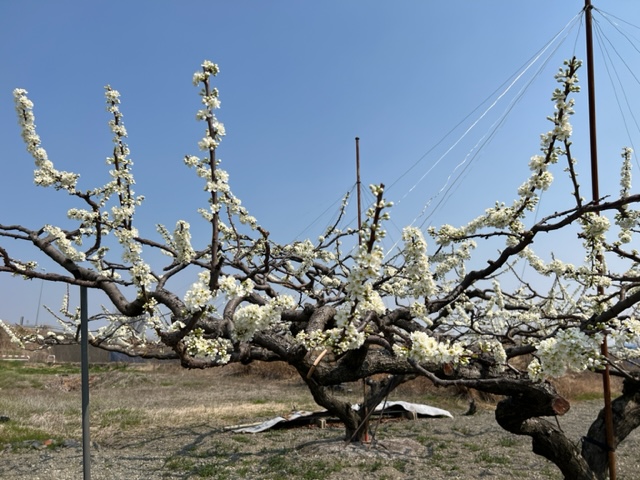 ここ数日の高温で一気に開花しているのが、すももの花(白色)です。すももの授粉用の花、ハリウッド(ピンク色)は満開のところも多い様子。妙了寺の桜は手前の桜が咲き始めました!全体的にはまだ1分咲きといったところでしょうか。本日も汗ばむ陽気で花の便りが急ぎ足でやってくるでしょう。