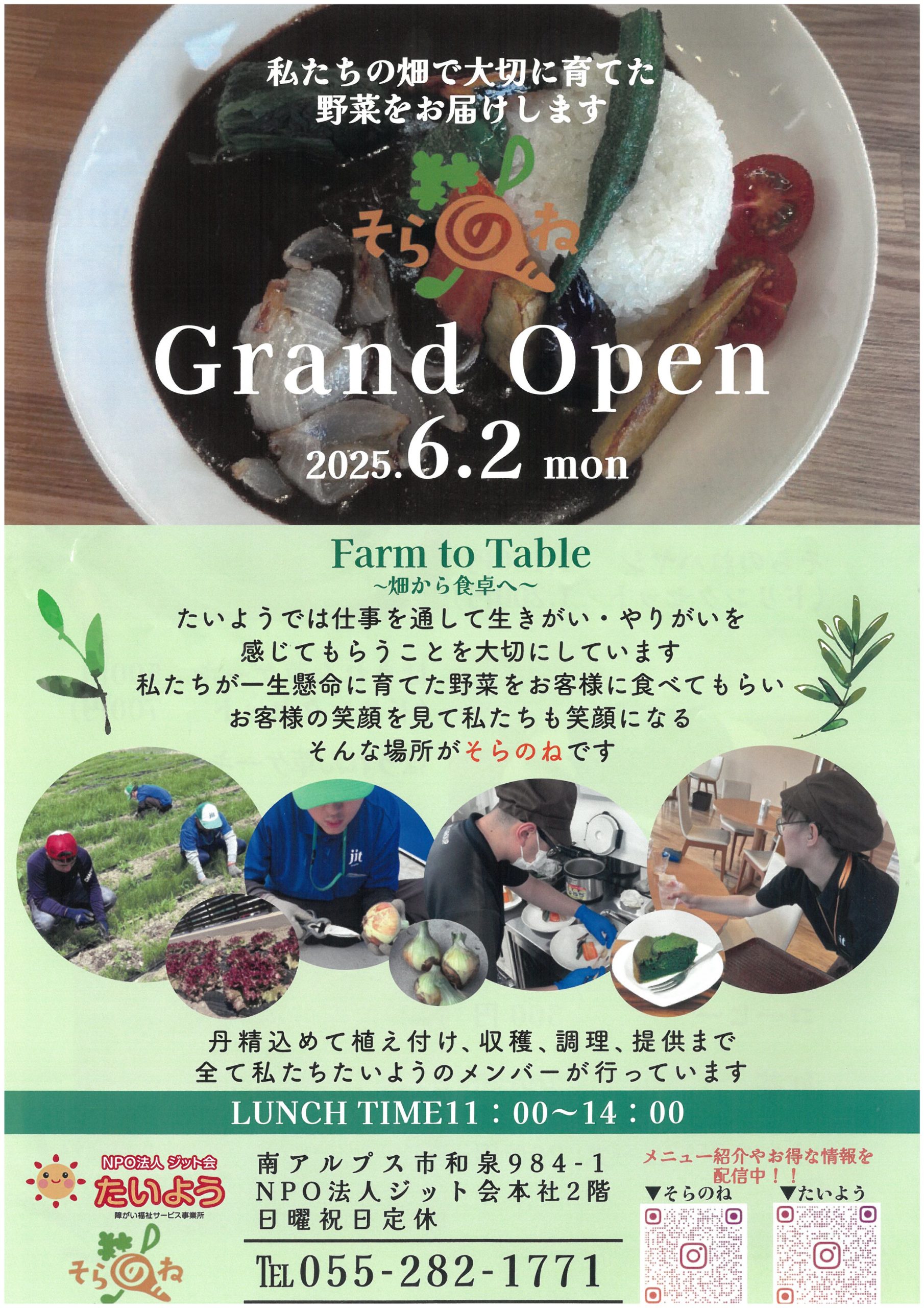 Jitグループたいようの皆さまが丹精込めて育てた野菜を収穫、調理、提供まで行っている「そらのね」がオープン!