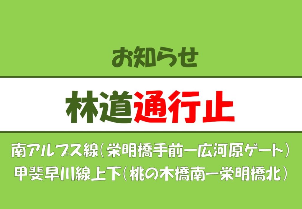 - 【林道南アルプス線】大雨による全面通行止め。