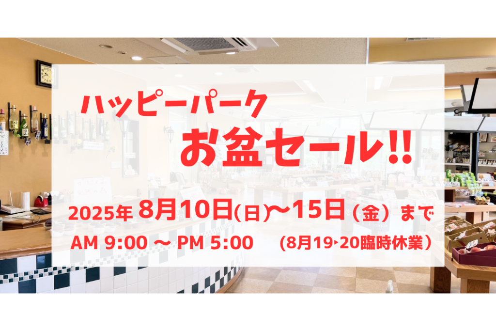 毎年恒例、総合交流ターミナルハッピーパークにてお盆セールを開催中。お盆用切り花やフルーツ盛り合わせ、採れたてのお野菜等を販売します。帰省のお土産用として県内のお菓子やお酒などもおすすめです。