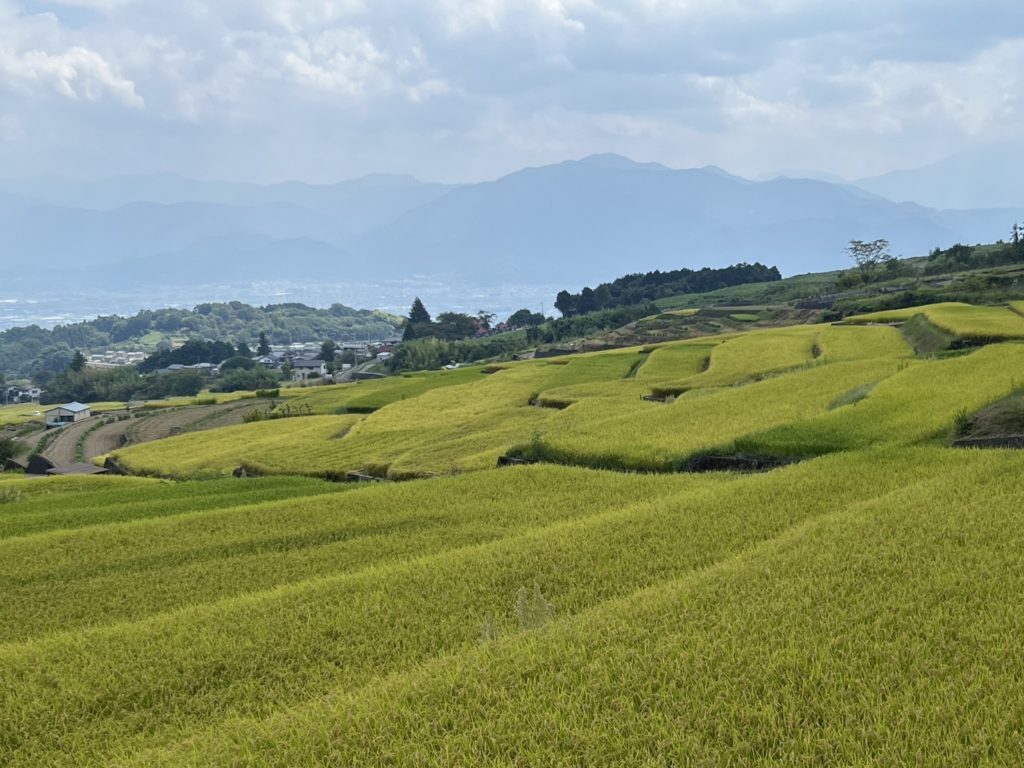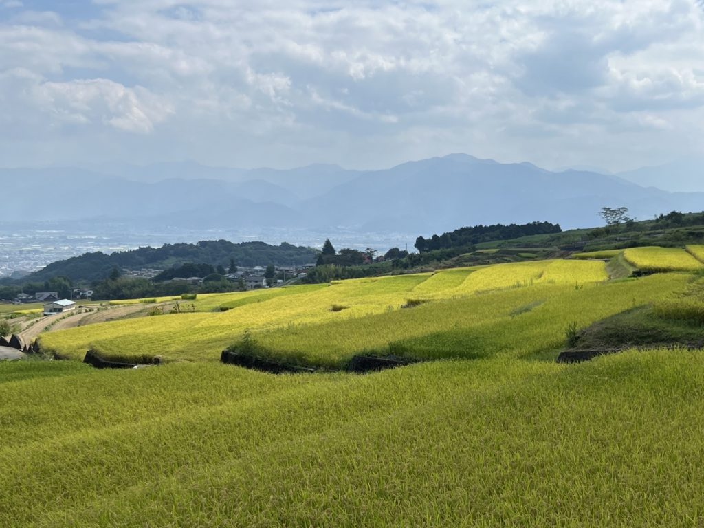 そうは言っても棚田の風景は黄みを帯びてきています。稲穂が風にゆられてカサカサと音を立ててトンボが飛び交う様子は、夏の終わりを感じます。
