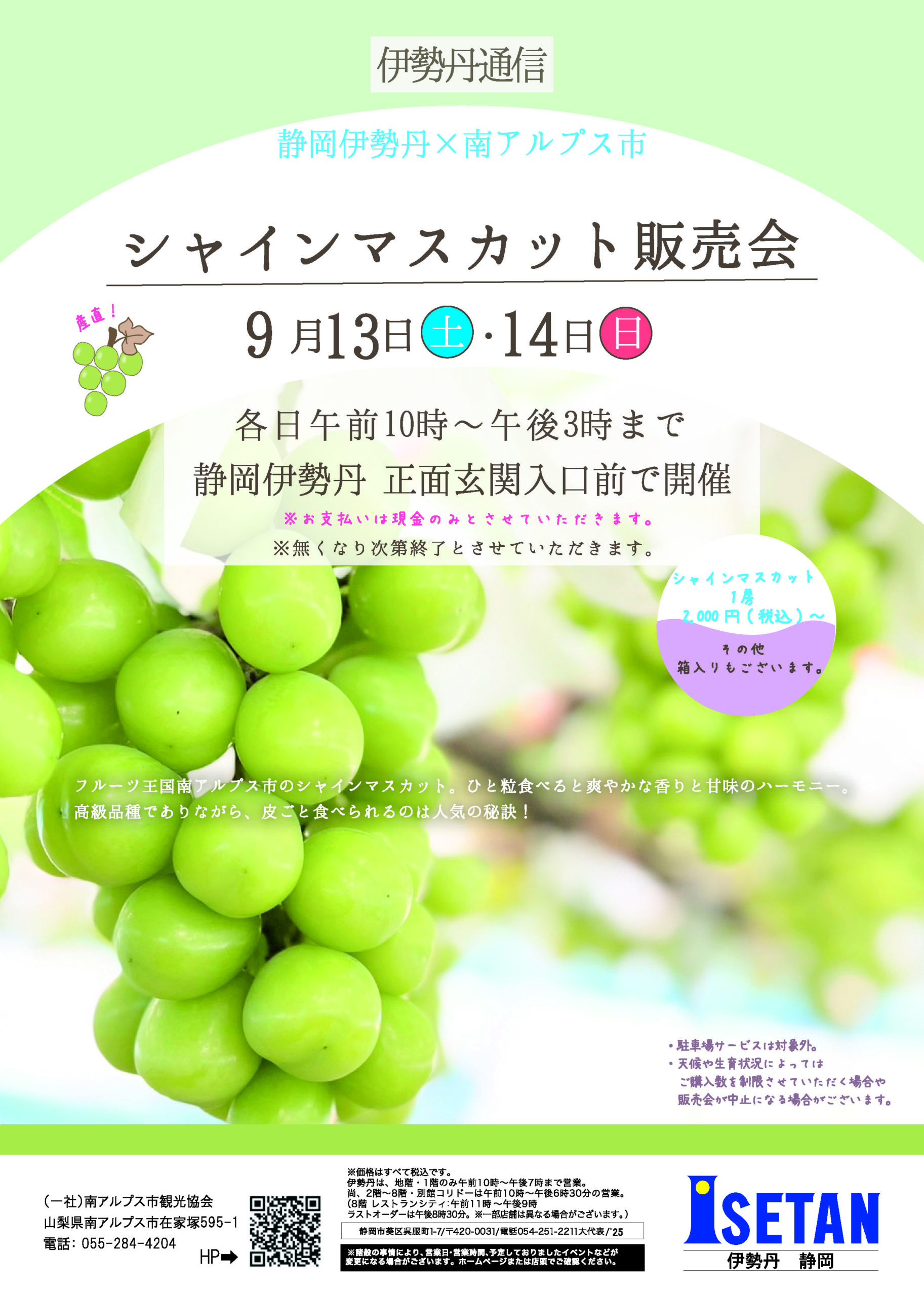 フルーツ王国南アルプス市より旬のぶどう、「シャインマスカット」を静岡伊勢丹にて販売します。
