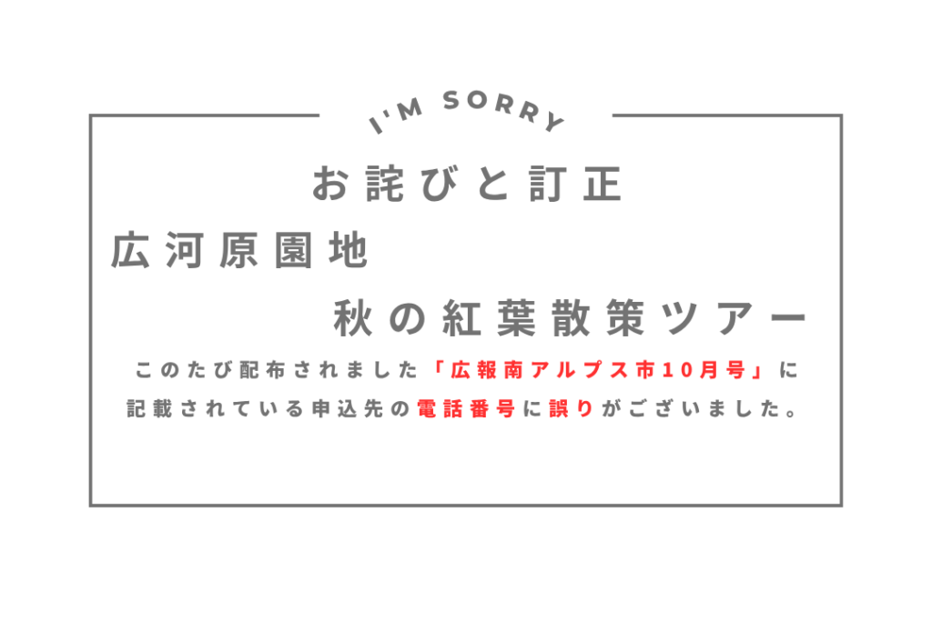 このたび配布されました「広報南アルプス市10月号」に記載されている「広河原園地秋の紅葉散策ツアー」申込先の電話番号に