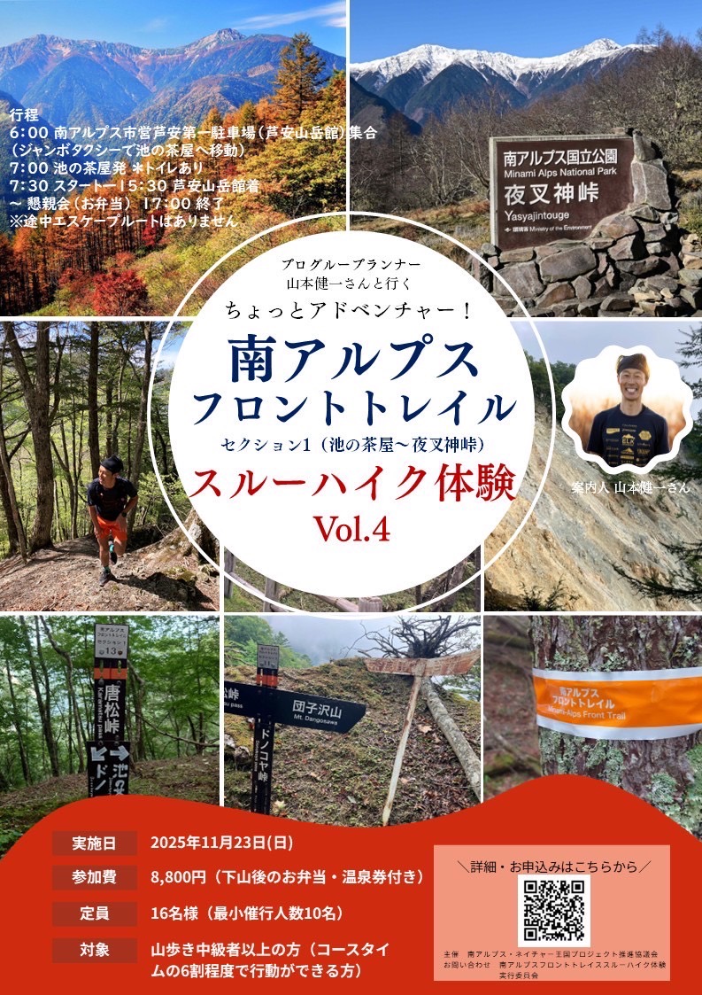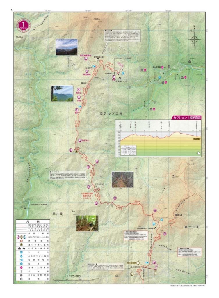 北から南アルプス市・富士川町・早川町の3つの市町のセクションまで整備されたこのトレイルのうち、今年は最北部のセクション1の区間を北上するルート(池の茶屋から夜叉神峠へ)を取り、スルーハイクする内容となっています。