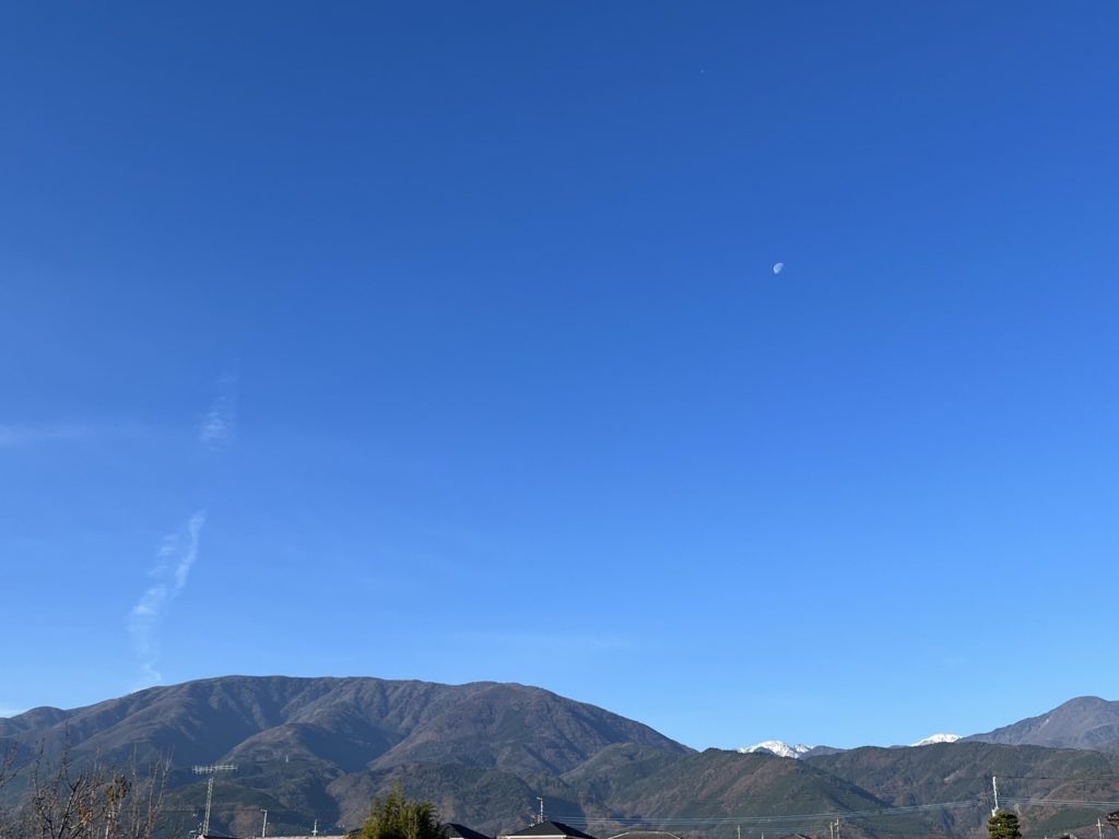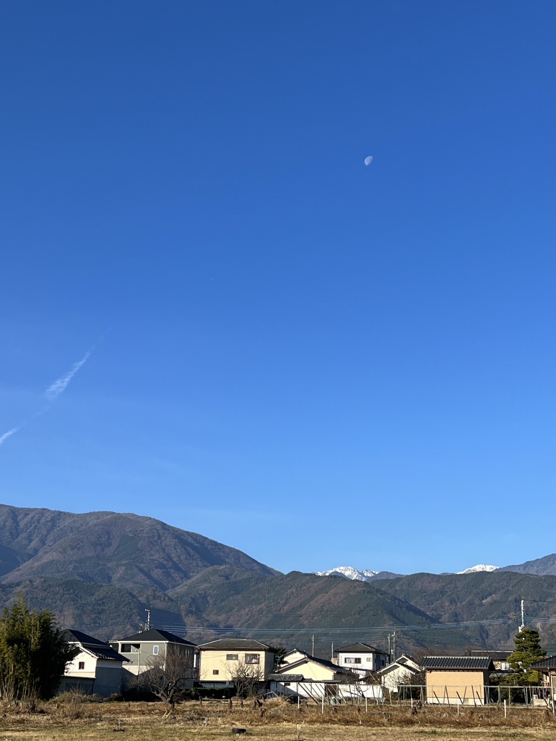 今朝は櫛形山の向こうに雪化粧した農鳥岳と間ノ岳がくっきり!さらにお月さままで…