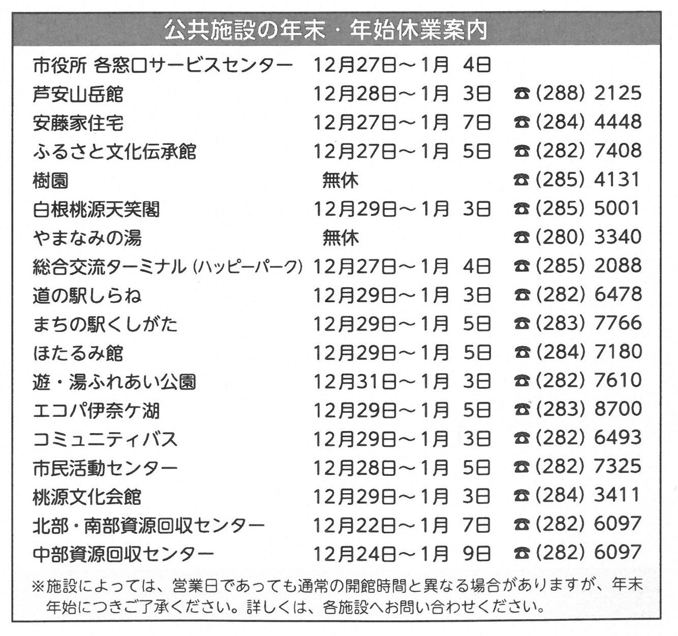 早いもので師走も半分が過ぎました。新しい年を迎えるにあたり慌ただしい毎日をお過ごしの方も多いと思います。気忙しく、事故の多い時期でもありますので、 十分にご注意いただき、過ぎゆく年をお過ごしください。市内公共施設の年末年始休業のご案内です。