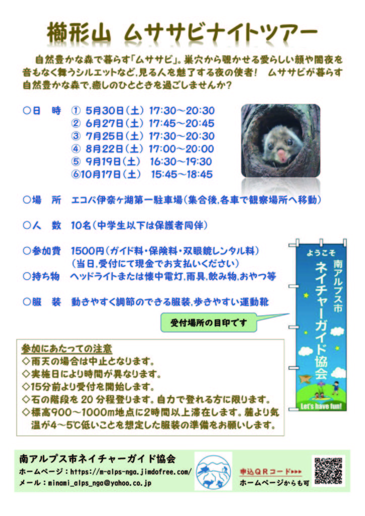 夕暮れの森を歩きながら、櫛形山に暮らすムササビの姿を観察するナイトツアーです。