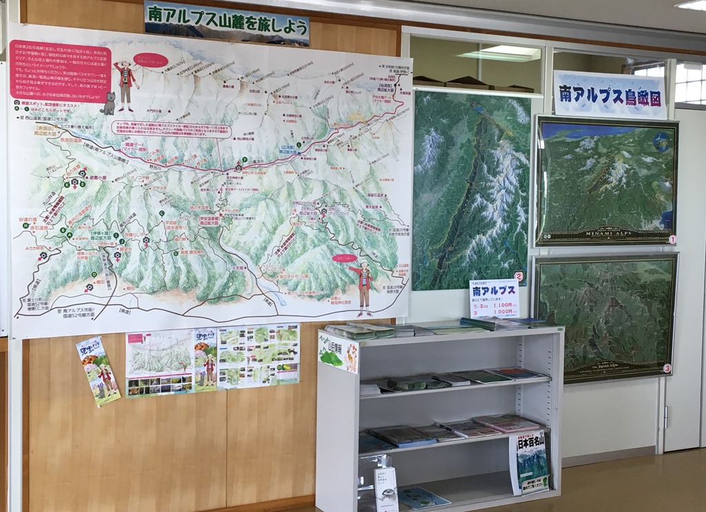 山の情報コーナーでは、南アルプス山麓見て歩きマップ等の配布や南アルプス鳥瞰図のマップも販売しております。