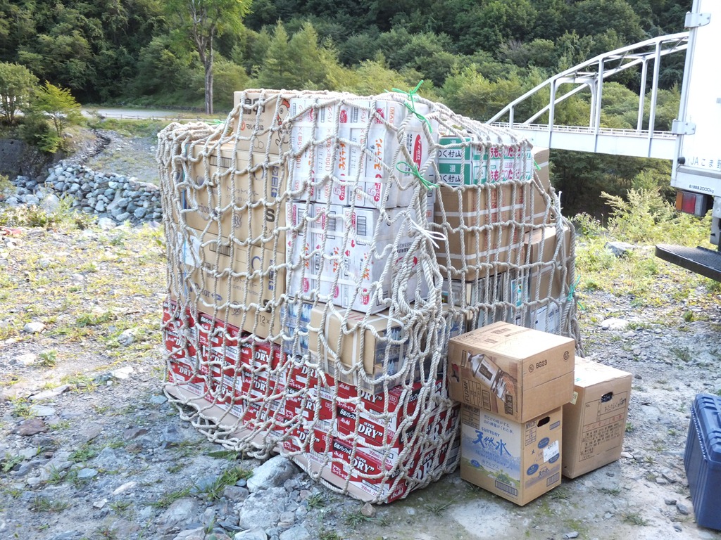 広河原にあるヘリポートには、早朝から食糧や物資が集められました。