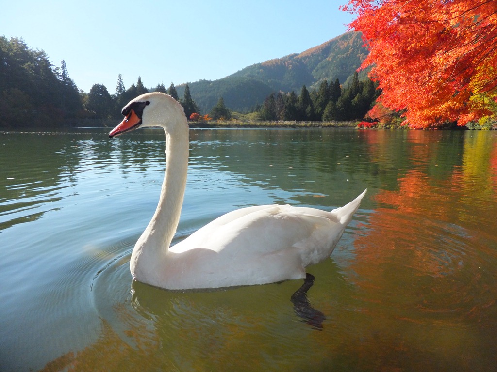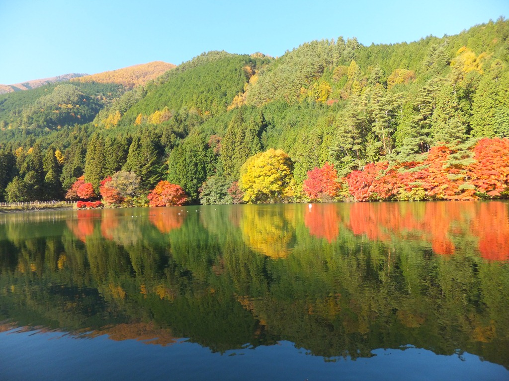 伊奈ヶ湖の湖畔を囲む木々も、その装いを赤や黄色に変え、私たちを楽しませてくれます。