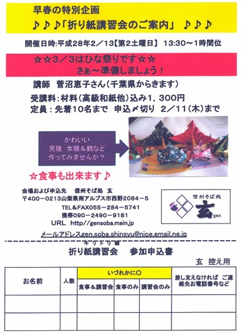 ● 会場はおそば屋さんの「信州そば処 玄」です。折り紙講習会に合わせ、おそばもご賞味ください。