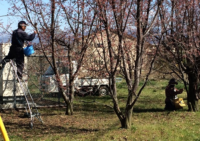 すももの花の受粉木のハリウッドの花。農家さんが花を集めていました。“貴陽”の受粉に使うとのことです。