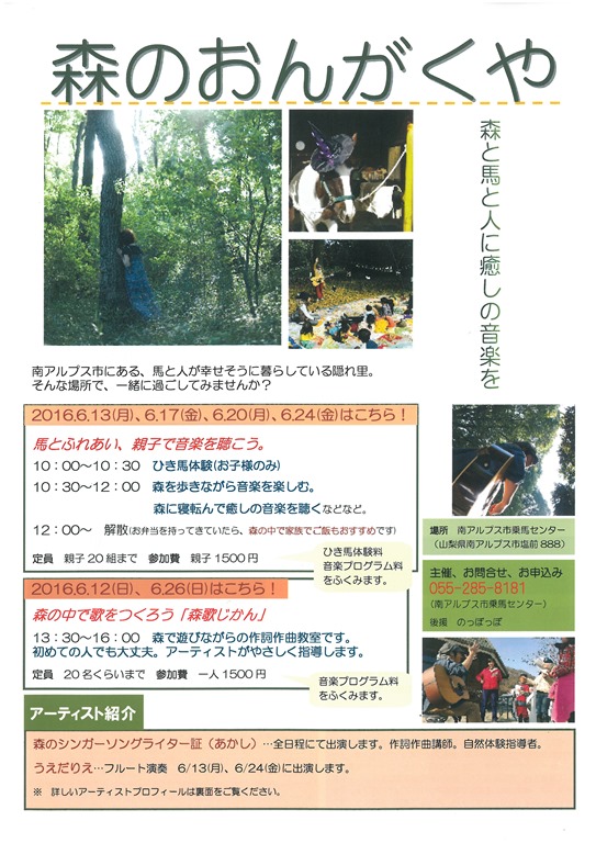6月は、音楽を通して森と馬と人に癒しを…というイベントが行われます。ひき馬体験やライブなど…自然の中でゆったりと過ごす癒しの時間になりそうです。