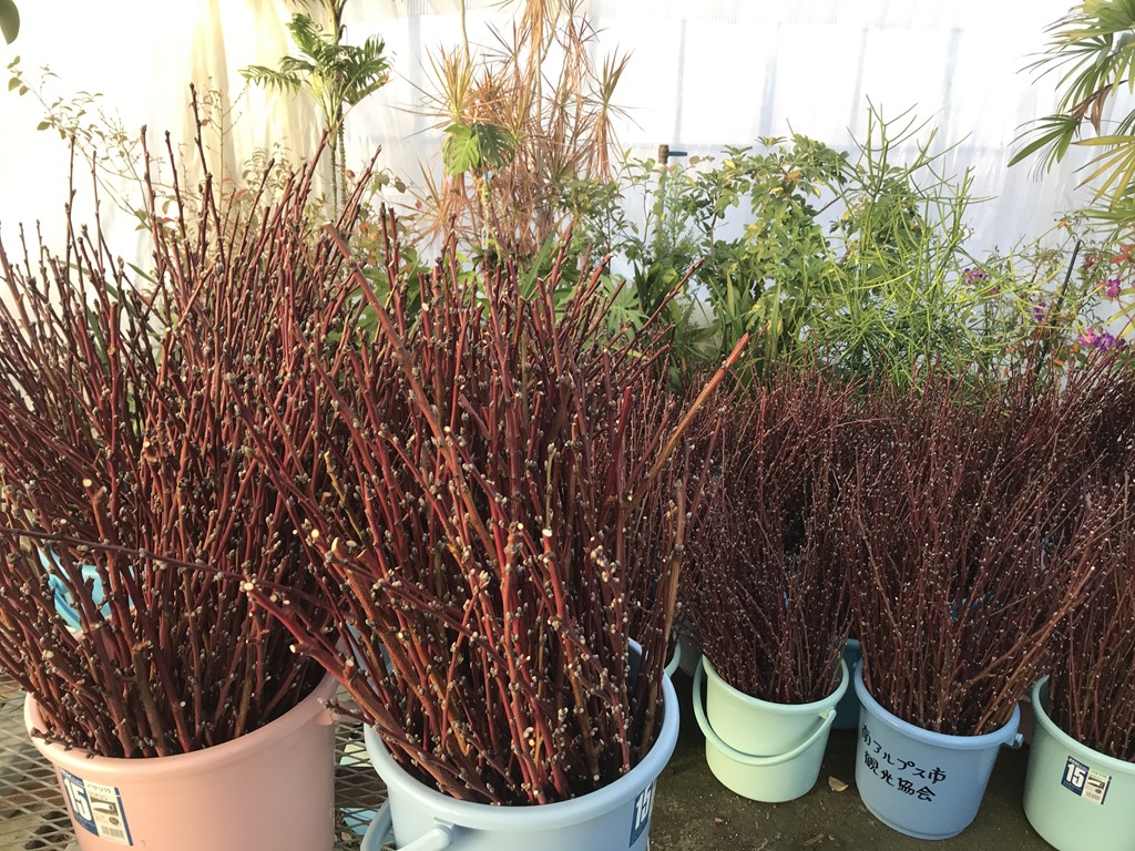 南アルプス市観光協会では剪定された桃の枝を譲っていただき、ハウス内で加温、水替え、