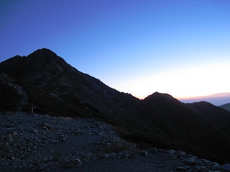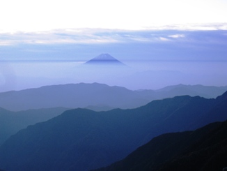 今日の日の出は5時30分、朝食は6時からなので、防寒着とヘットライトを装着し山荘の外へ、昨日の夕方とはうって変っての無風状態。まだ、日の出ではないが、富士山が雲の上に顔を覗かしているのが肉眼でもよく分かる。眼下に広がるはずの夜景はうっすら浮かび上がり、黎明の空は果てなく続く宇宙をも感じられるほど幻想的。残念ながら南アルプス市街地から北岳を望める場所は限られているので、この光の集合体は中央市・市川三郷町と思われる。