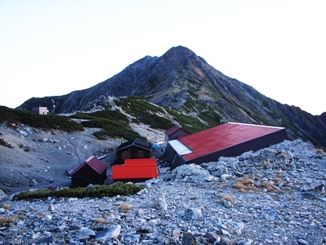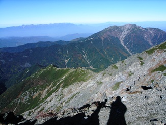 目的達成の「安堵感」が「満足感」を超えないうちに、下山準備を促す、「まだ、帰り道がある。俺はこのパティーのリーダーだから気を引き締めないと」気分を「下山モード」に切り替え、山頂から仙丈ケ岳・甲斐駒ケ岳を見ながら下山を開始。登りより下りの方が緊張度が増すのは私だけではないはずです。足場を確認しながらゆっくりゆっくり確実に歩を進めます。「みんな大丈夫かな?」休憩をはさみながら登山道を行く。やがて、青い屋根の肩の小屋が徐々に見えてくる。屋根には布団が干してあり、従業員の方々が雪害対策&小屋閉めに向け、ペンキを塗り直していました。 肩の小屋は半年の間、雪の中へ埋まってしまいます。雪が塗料を溶かしトタンを浸食してしまうので、雪害対策としてペンキを塗り直しするそうです。