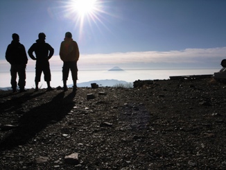 ふと富士山の方を見ると雲海の白色と空の青色の接点にまるで地平線のような水平に延びる線が見える。あれは何だ??各々の解釈・見解・疑問を口にしつつ答えは出ませんでした。なんなんでしょう?(後で知り合いから聞いたことですが、この水平に延びる線は、線より上が非常に寒く線より下が暖かく、この真ん中ではか気流の変化がおこり帯状に見えるとのこと・・・?もっと詳しく知りたかったのでインターネットで検索したがヒットせず。なにせこの現象の名前を知らないので・・・)