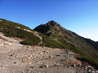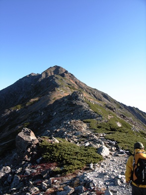 トイレを済ませて「さぁ出発だ!!」 お世話になった北岳山荘の管理人さんにお礼を言い外へ出ると・・・ な、なんと、天気最高!北岳には雲一つもなし!!我ながら自分の晴れ男ぶりに感心、職場のとってもお世話になっている先輩から【晴れ男POWER】をもらってきたかいがありました。まさかこの北岳でも先輩のお世話になるとは・・・。