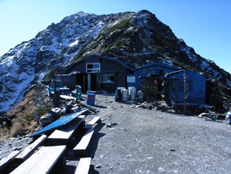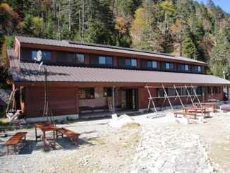白根御池小屋到着。同じく白根御池小屋でも従業員の方々が雪害対策に向けて、雪が付きやすい部分のペンキを塗り直していました。ここらで、メンバーのお腹がすいたので昼食タイム。 白根御池小屋は平成11年に雪崩で倒壊した後、仮設のプレハブで営業していましたが、平成16年から新築工事を行い平成17年10月に完成し、平成18年6月から新築オープンしました。