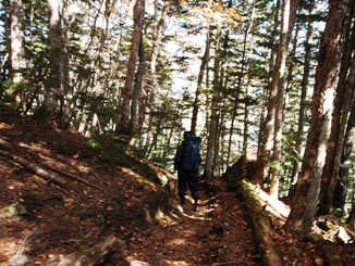 周囲は針葉樹林に変り、登山道は急勾配でハシゴが数箇所設置してあります。