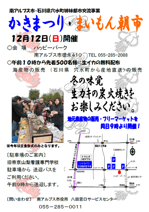 なぜ海の幸のカキなのか? まいもん朝市? と思われるでしょう! 南アルプス市が姉妹都市交流を行っている石川県穴水町の特産品がカキなのです。そして、「まいもん」とはおいしいものということだそうです。