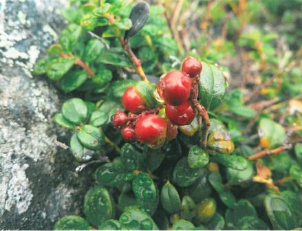 | 花盛りのトラバース道 | 色づき始めたコケモモの実 |