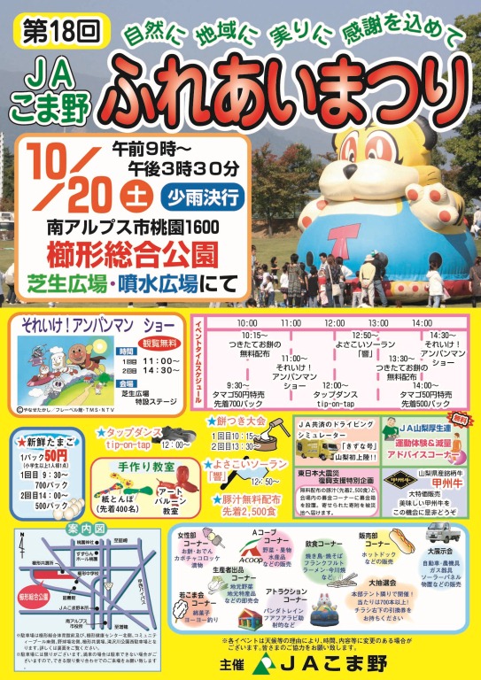 南アルプス市 櫛形総合公園において「第18回JAこま野ふれあいまつり」が開催されます。