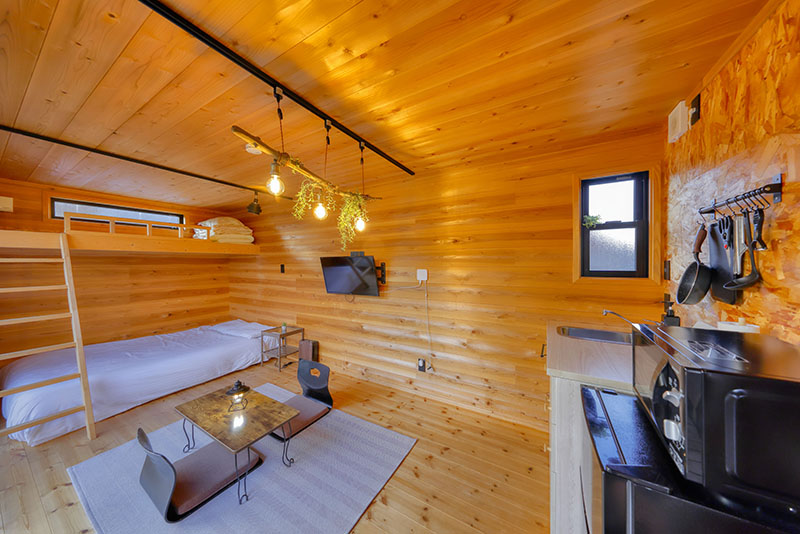 自然に包まれたタイニーハウスやログハウス、娯楽を楽しめる1室などお客様の人数や目的に合わせたお部屋を提供します。