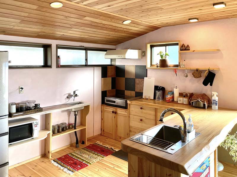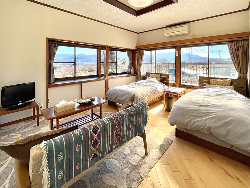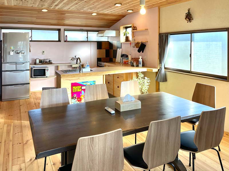 自然ゆたかな果樹園風景がひろがる一軒家の民泊施設です。素泊まり(共同キッチン付き)の施設ですので高級ホテルや旅館とは違いますが、お友達や親戚の家に遊びに行くような感覚でゆっくりおくつろぎいただけます。