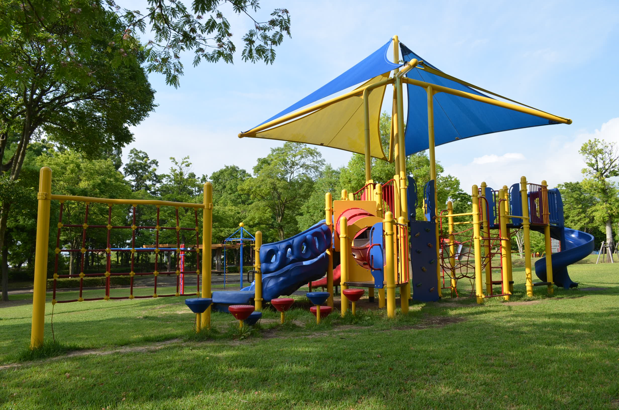 遊具の数は県内一!。水辺で遊べる中央広場や緑の中を走り抜けるクロスカントリーコースやストレッチコースも充実。