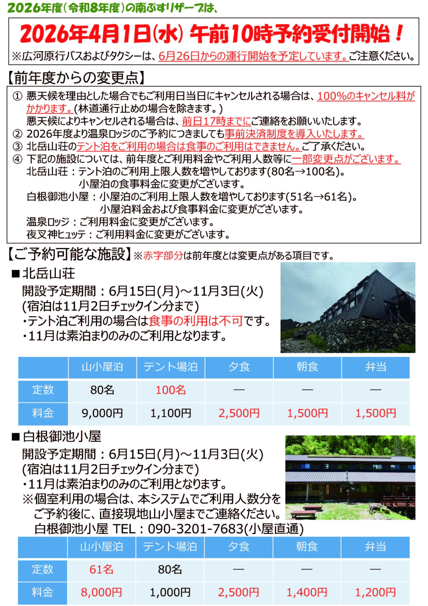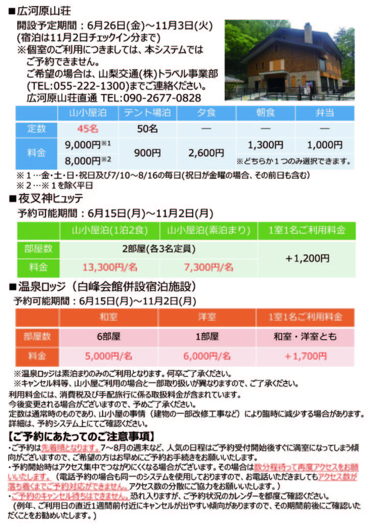 令和8年度の北岳山荘・白根御池小屋・広河原山荘の予約開始は、以下の予約サイトにて